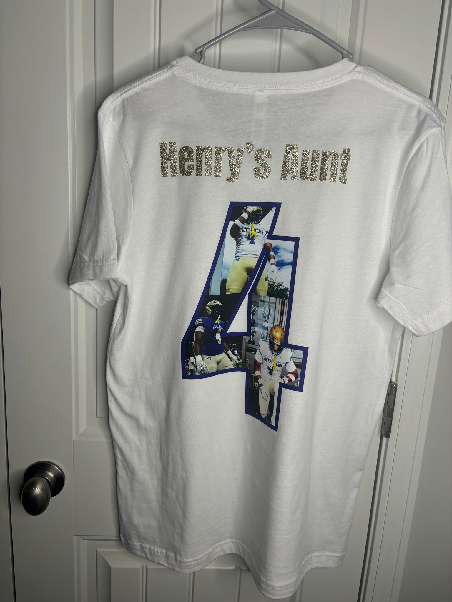 Use the number 5.  I want the text to say: Henry’s aunt in gold glitter. I want blue surrounding the number. I’ve uploaded the pictures I want added. On a white shirt. Size medium.